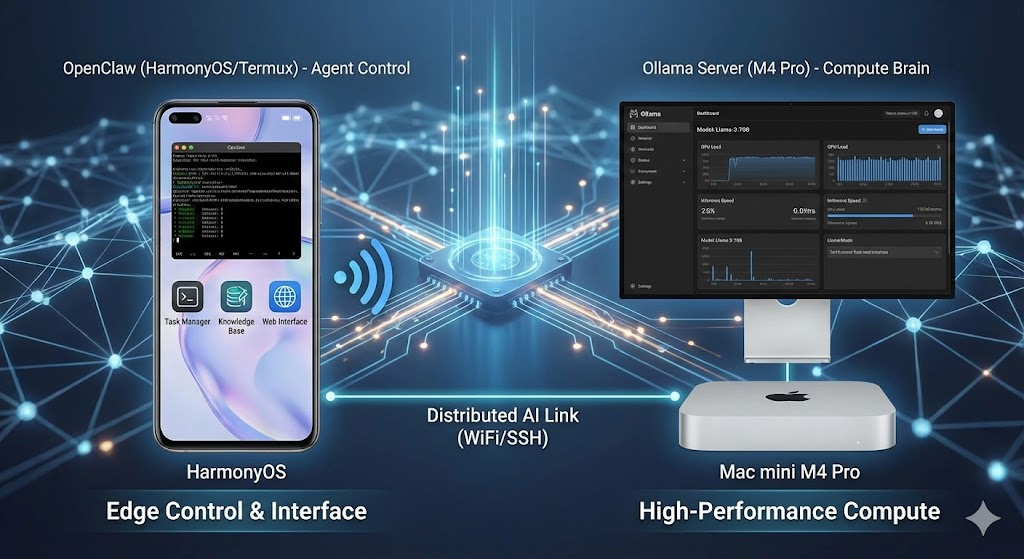 TL;DR: We built a distributed AI system where a Huawei phone acts as the “Control Node” (running OpenClaw/Node.js via Termux & Proot-Distro) and a M4 Pro acts as the “Computing Node” (running Ollama). This architecture bypasses mobile hardware limitations while leveraging Apple Silicon’s high-bandwidth memory for fast inference.